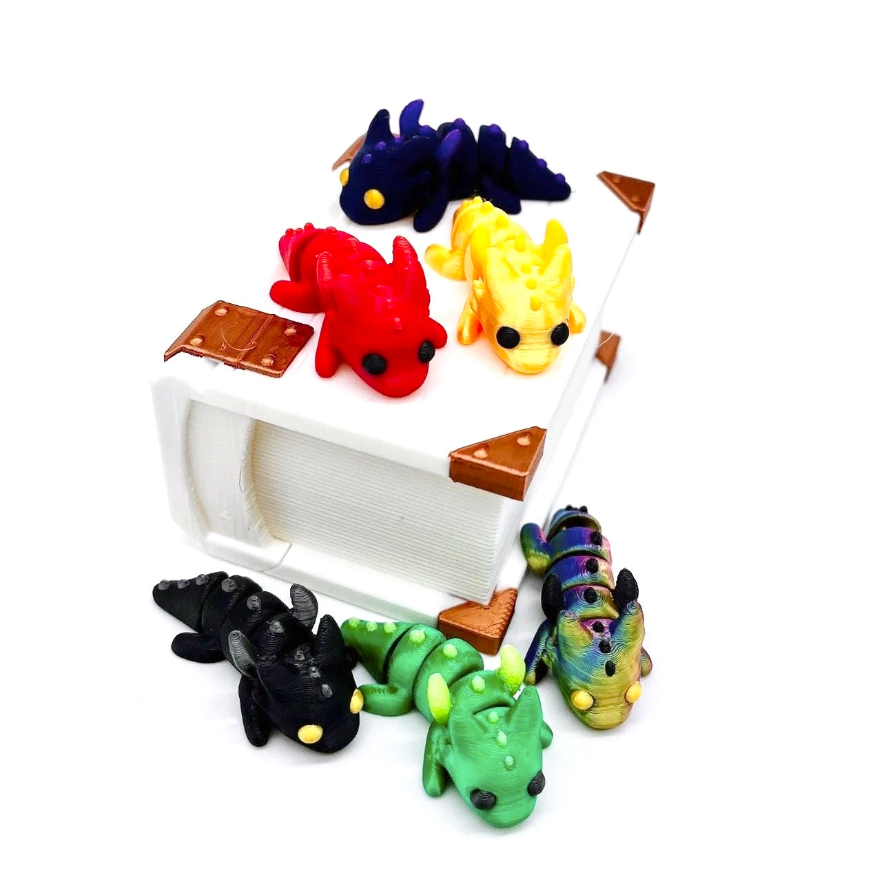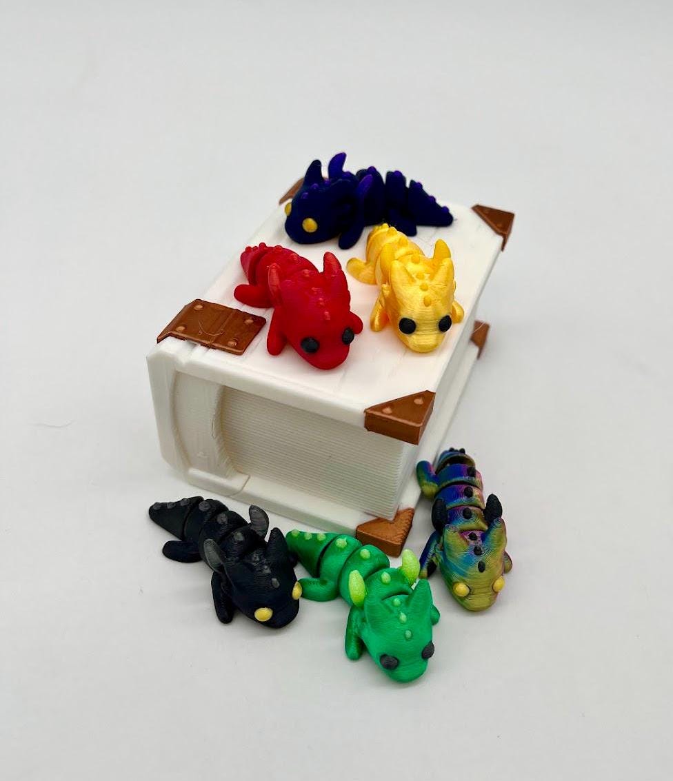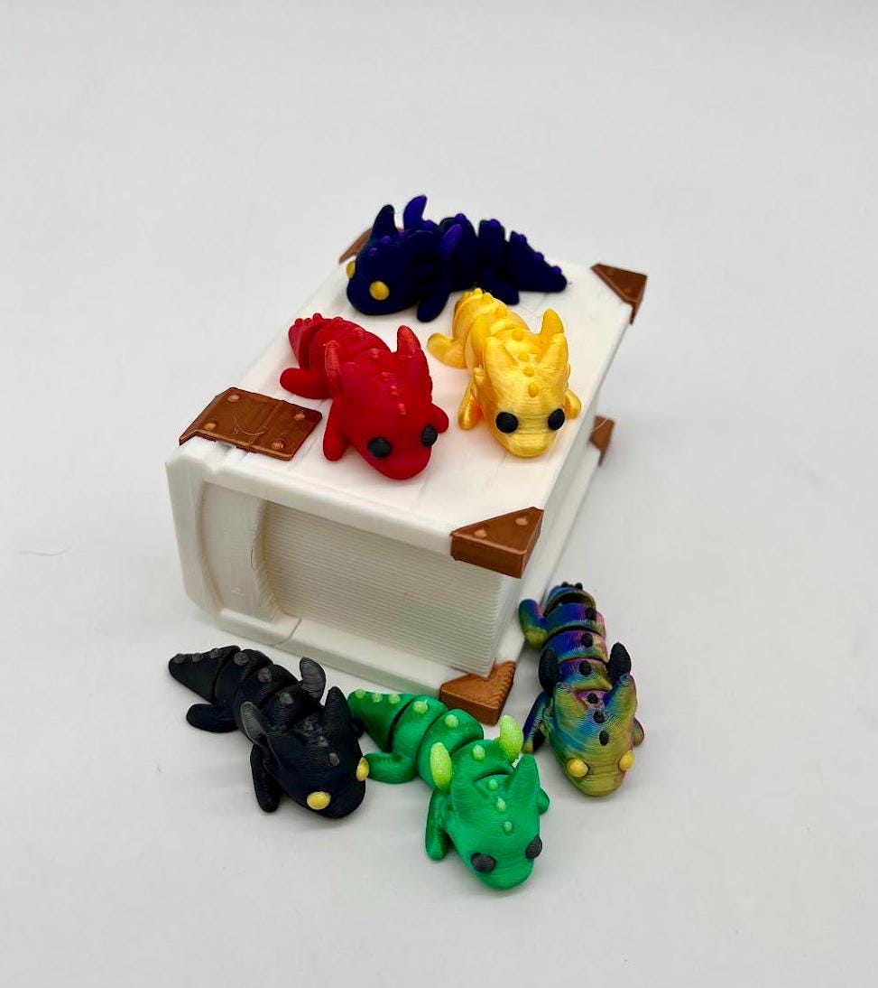 Inspired by the best selling book series, this pocket-sized 3d printed book box features six mini dragons based on the dragons in the Fourth Wing and Iron Flame novels. Each book box includes one of each dragon: black, navy, gold, color-shifting, red, and green. The book is pure white with shiny copper accents.