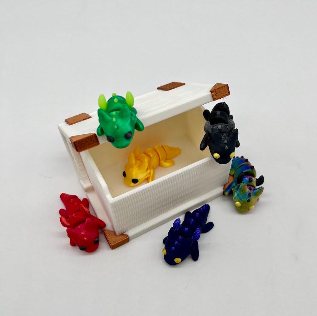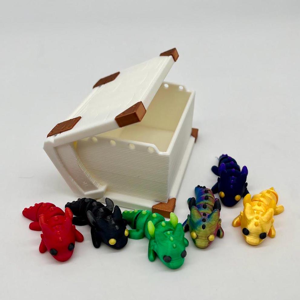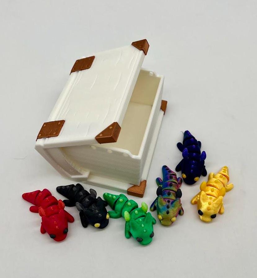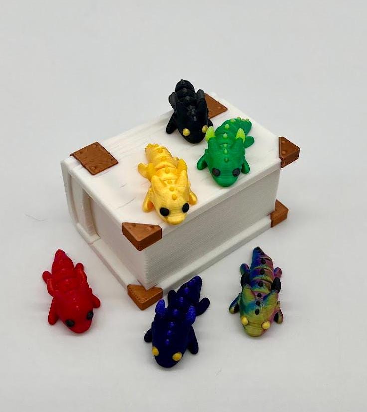 Inspired by the best selling book series, this pocket-sized 3d printed book box features six mini dragons based on the dragons in the Fourth Wing and Iron Flame novels. Each book box includes one of each dragon: black, navy, gold, color-shifting, red, and green. The book is pure white with shiny copper accents.