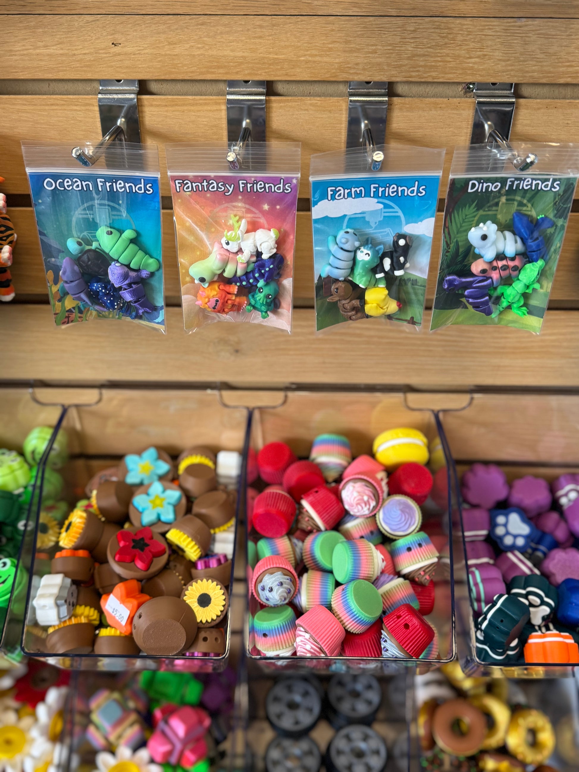 Delight your customers with this collectible 5-pack of articulating mini fidget creatures. Each set includes five vibrant, detailed minis that kids love to collect, trade, and fidget with—chosen from over 100 unique designs in our growing lineup. Packs are available in fun themes, making it easy to build excitement and variety in your store. Designed with eye-catching packaging, these 5-packs hang neatly on display racks, offering a clean, organized, and engaging presentation for shoppers.