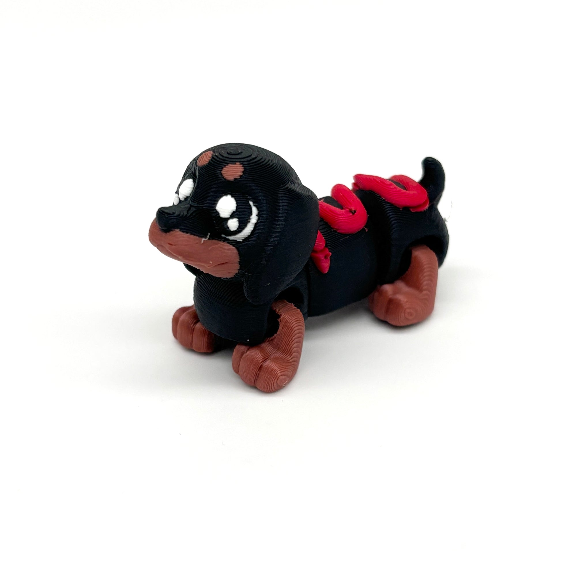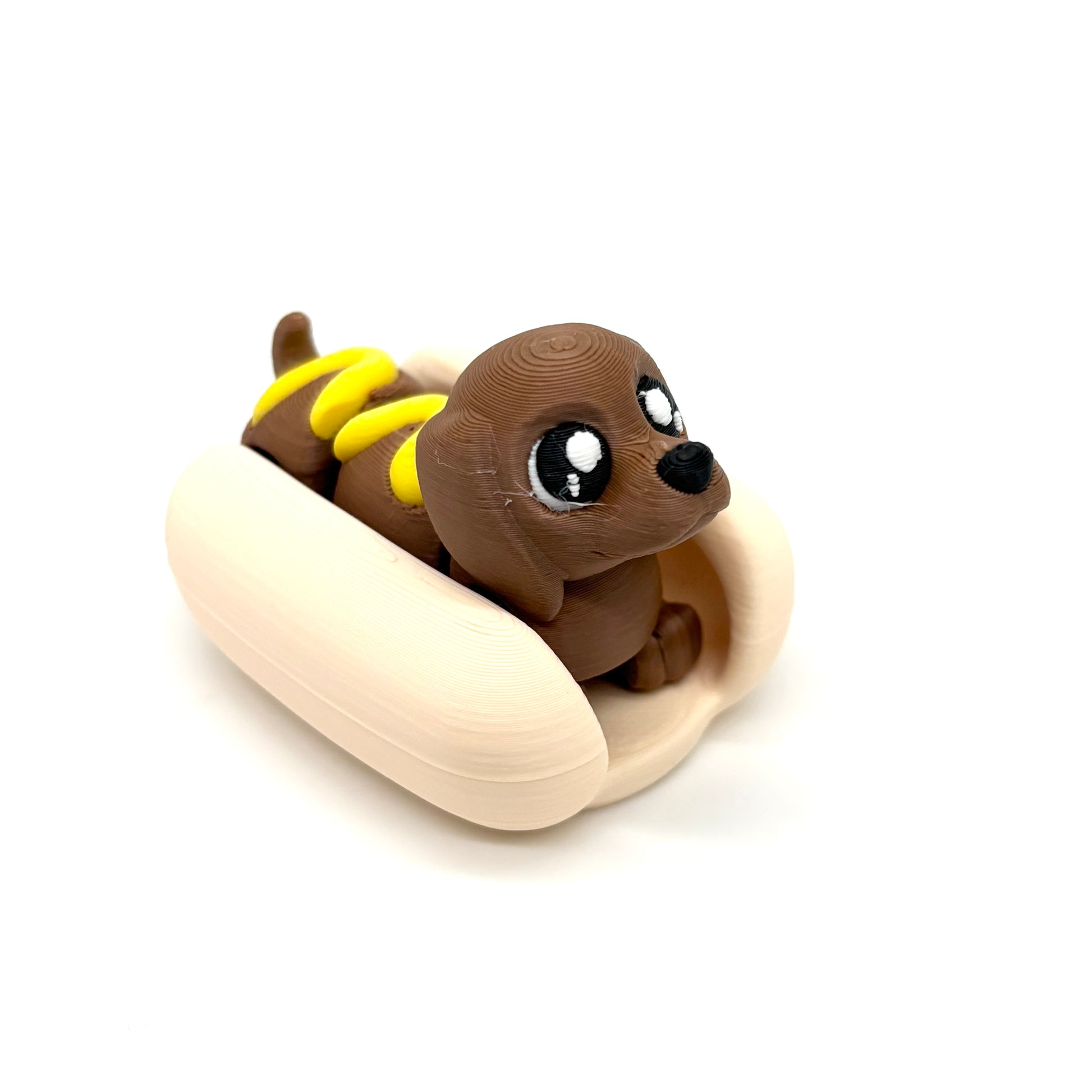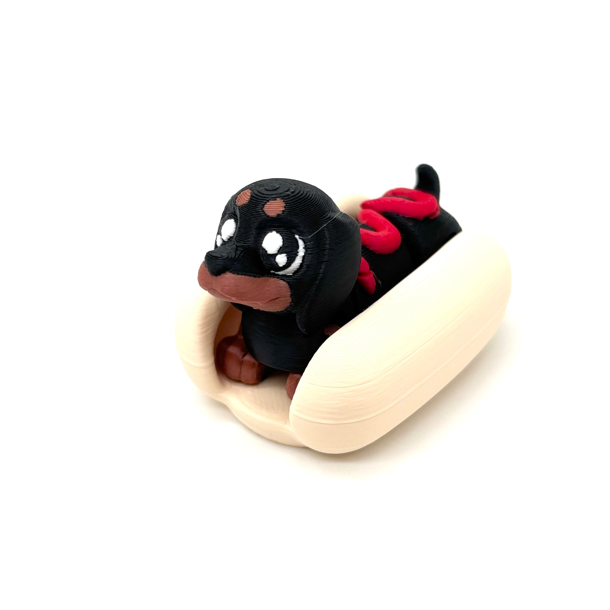 Adorable dachshund articulating dog fidgets served atop a 3D printed bun! Mustard or ketchup or buy them both for the complete set!