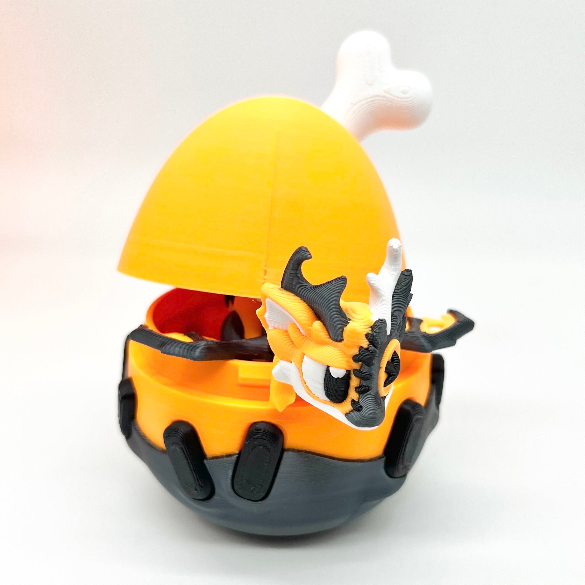 Crack open the spooky magic of Halloween with this 3D printed dragon egg! Designed in festive pumpkin orange, bone white, and midnight black, this adorable egg features stitched details, bone accents, and a pumpkin-themed dragon peeking out, ready to hatch into your collection. Perfect for Halloween lovers and dragon fans alike!”